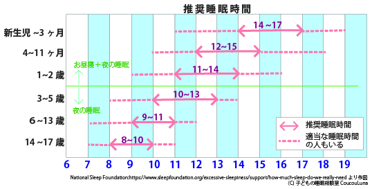 1日に必要な睡眠量の目安は下の通りです。特に、小学生低学年までは夜の睡眠は”最低“10時間以上を目安にお過ごしください。